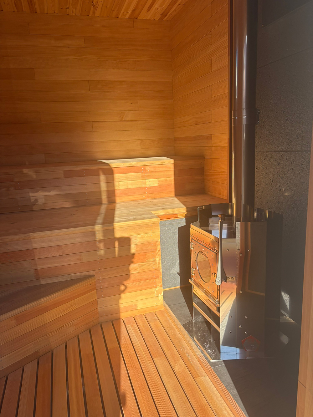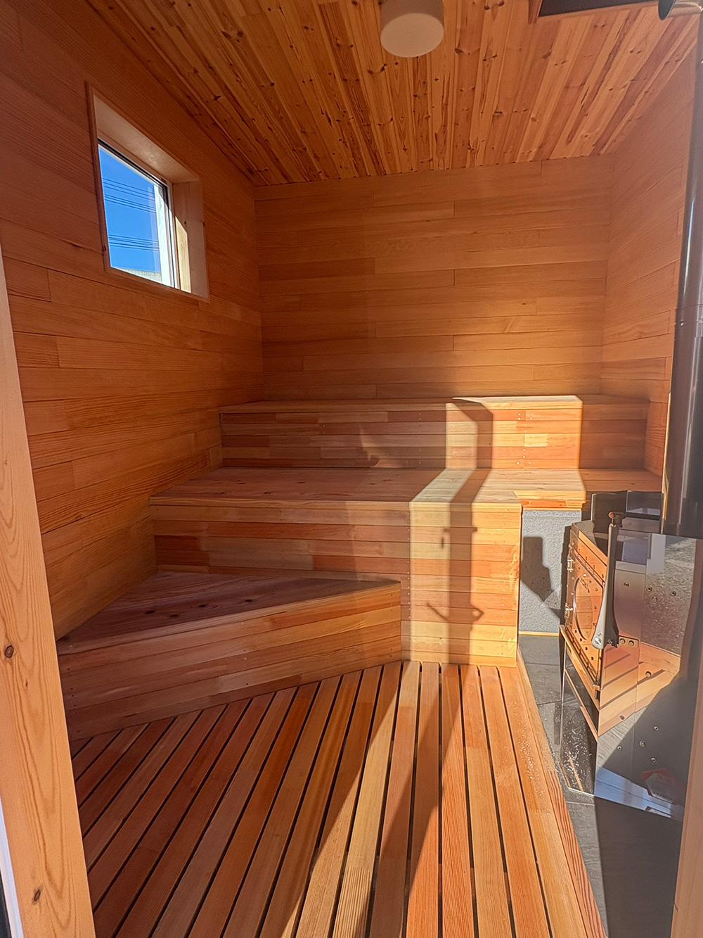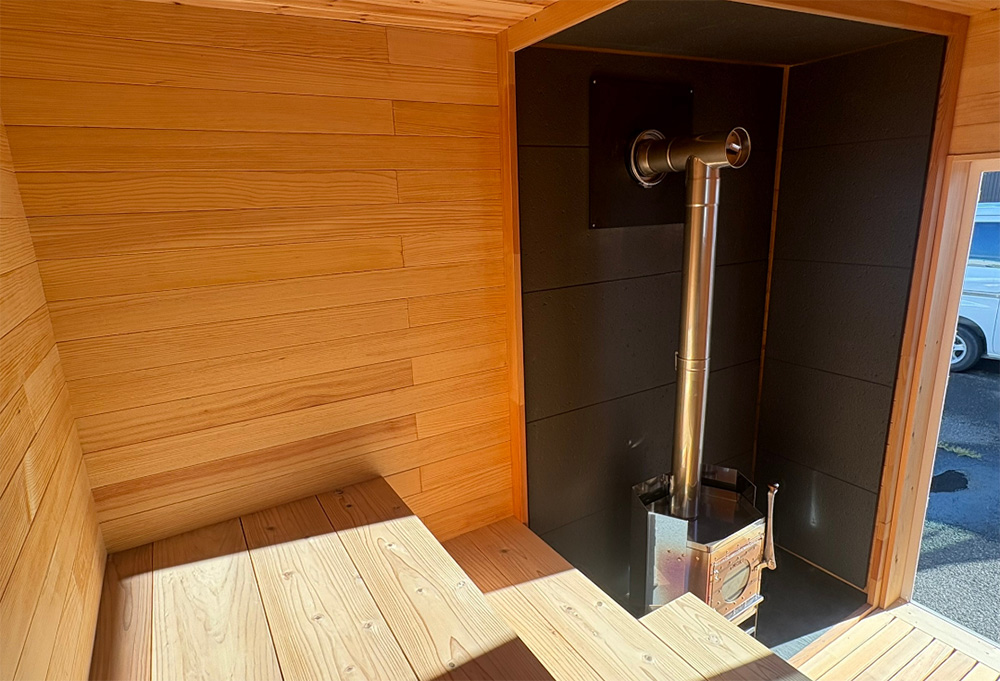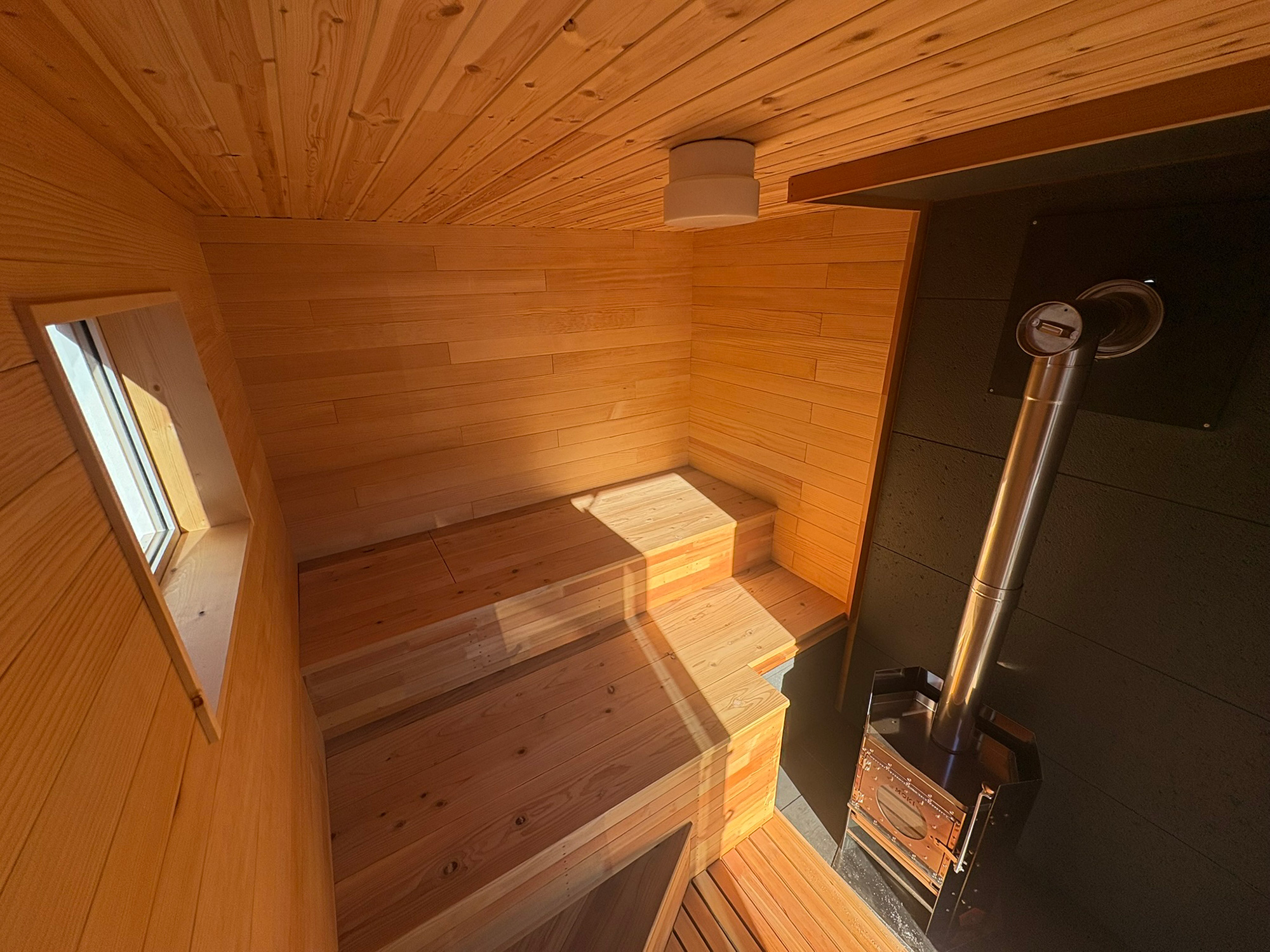 仕事や勉強に集中したい時、好きな音楽を流してリラックスしたい時、ヨガをしたい時。 個室のサウナ室は、プライベート空間としての役割も果たします。 薪ストーブであれば電源を全く使わない薪が熱源なので、冬の災害・停電時の避難場所としてもこの上なく役立ちます。